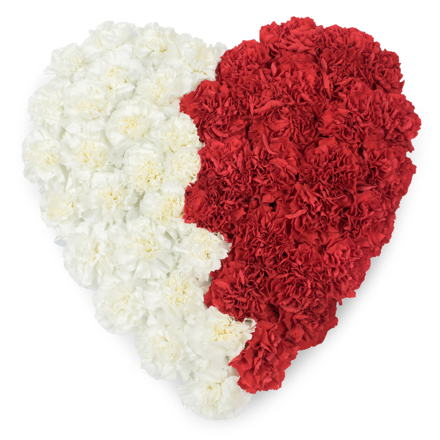 Our heart-shaped carnation arrangement is a beautiful expression of love and sympathy. Featuring a vibrant mix of white and red carnations, each flower is hand-picked to ensure exceptional quality and freshness.
